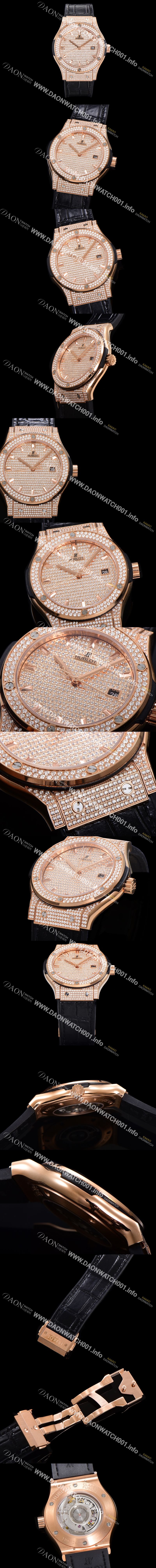 • [휴블렛] 남성용 클래식 퓨전 565.OX.9010.LR.1704 다이아몬드 셋팅 큐빅/보석 다이얼 18K로즈골드 42미리 오토매틱 2892 타입 가죽/우레탄 믹스밴드 hub2127