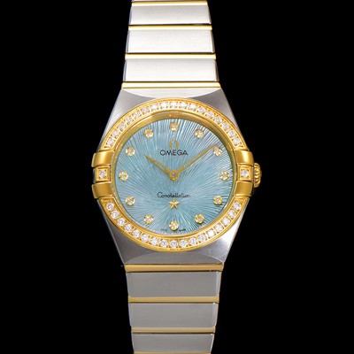 Omega Ladies Constellation Yellow gold diamond set bezel 28mm quartz movement Green dial